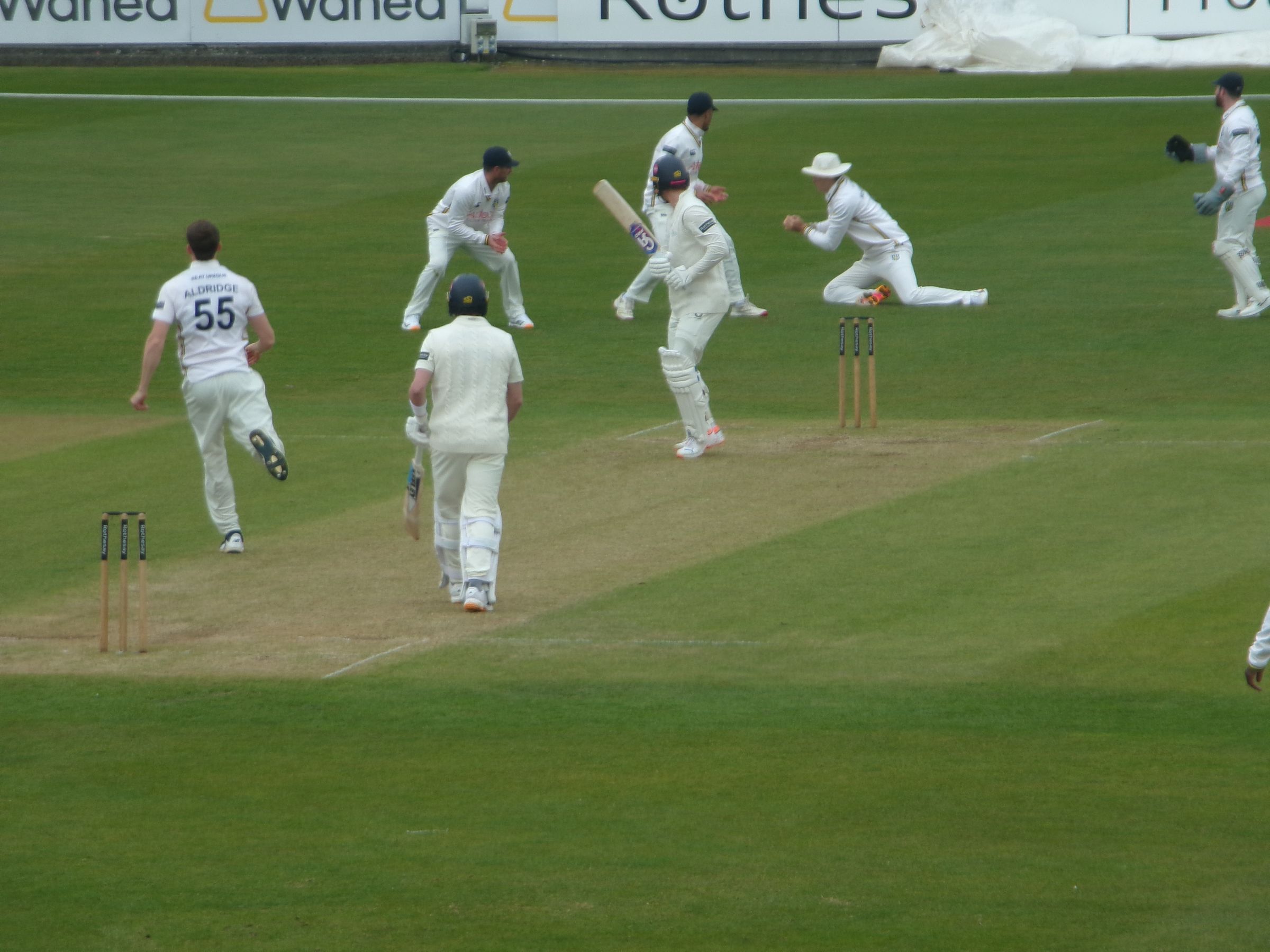 However, his support cast kept on tumbling with Chris Benjamin departing for 19 to hand Aldridge a maiden First Class wicket for Durham after he drove one straight to Raine at cover.